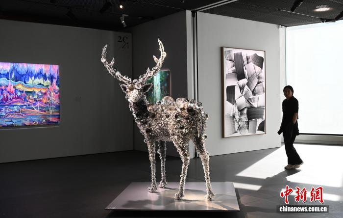 图为现场展现的缓哀鸿(中)取弛年夜千的艺术大作。记者 李志华 摄
